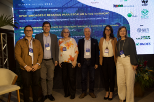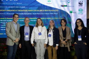 The following panel, ‘Unlocking the restoration market: innovation and scale in the private sector’, featured Mauricio de Moura Costa (BVRio / PlanaFlor), Thiago Picolo (Re.Green), Carolle Alarcon (Brazil Climate, Forests and Agriculture Coalition), Alessandra Caiafa (Sobre) and Ana Garrido (Ecosecurities), moderated by Ana Cecília Gonçalves (WRI Brazil).